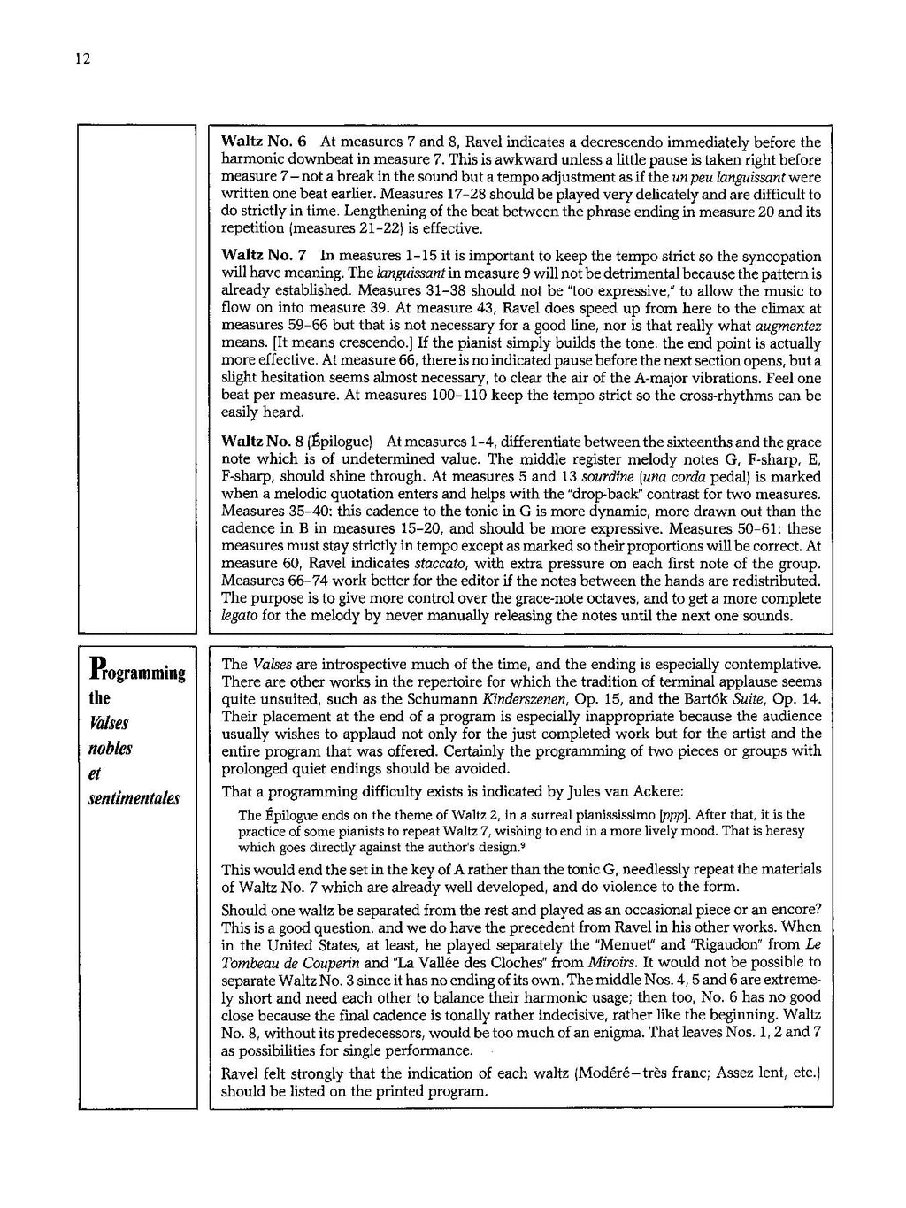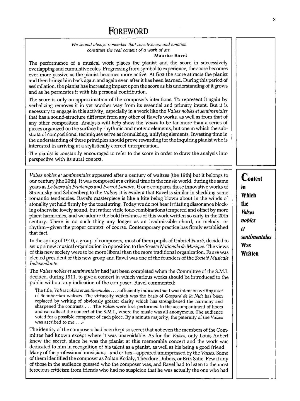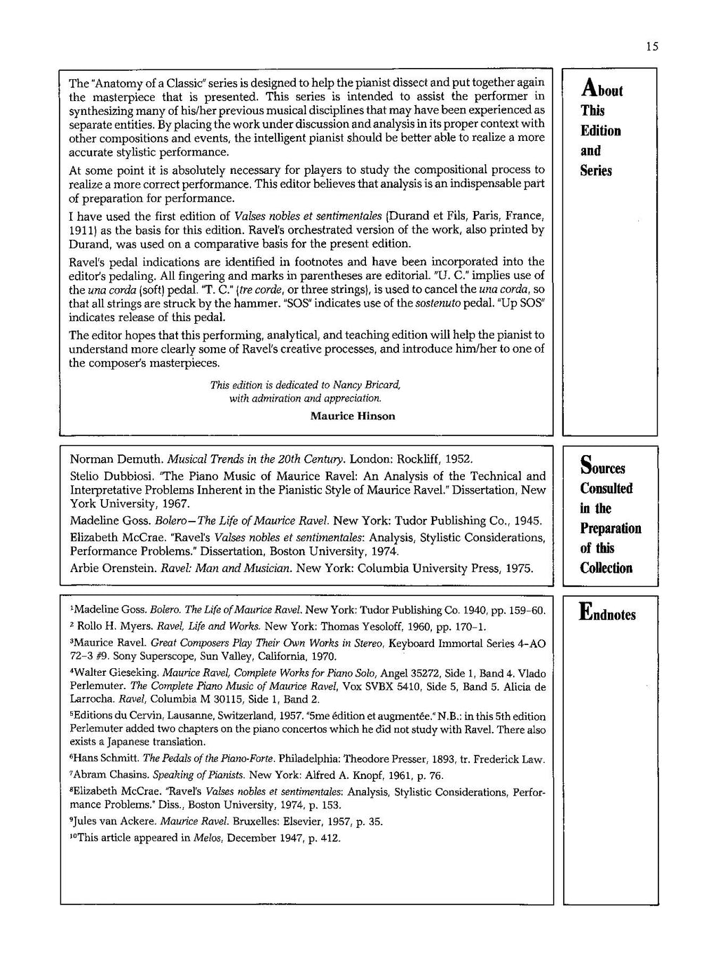 Composed by Maurice Ravel in 1911, this set of eight waltzes was inspired conceptually by 19th century waltzes by Franz Schubert and Johann Strauss. The work beautifully reflects Ravel's daring early 20th-century style. It's subtle harmonies caused Debussy to comment, "It is the product of the finest ear that ever existed." This teaching/performance-oriented edition by Maurice Hinson includes suggested fingerings, performance advice, and discussions about tempo, pedaling and dynamics. 40 pages.