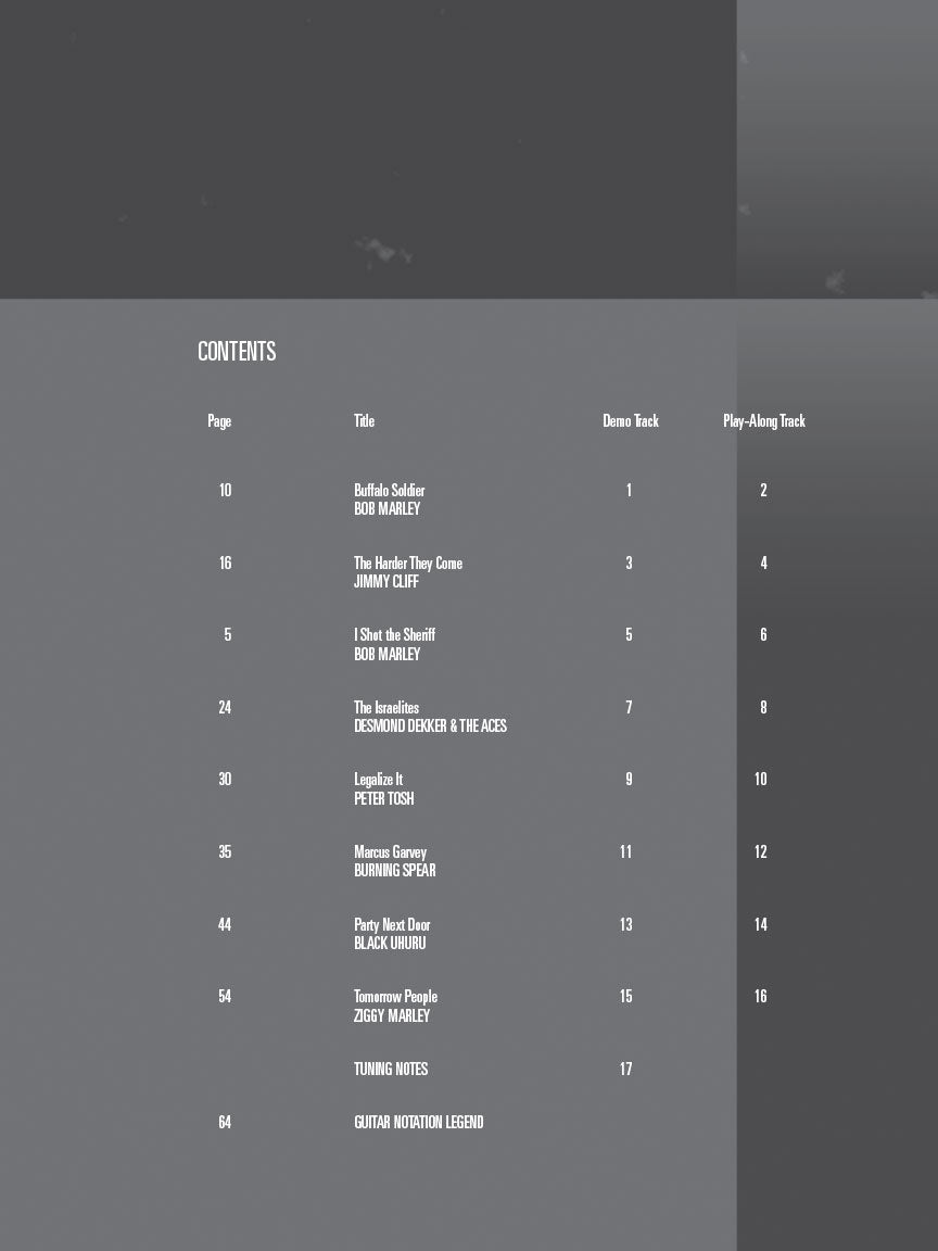 This volume features 8 reggae favourites: Buffalo Soldier • The Harder They Come • I Shot the Sheriff • The Israelites • Legalize It • Marcus Garvey • Party Next Door • Tomorrow People