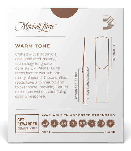 Mitchell Lurie Premium Bb Clarinet reeds are the go-to choice for advancing players, providing the warmth and clarity of sound necessary to take your playing to the next level. These reeds are unfiled, featuring a thinner tip and thicker spine--which add resistance without sacrificing ease of response.