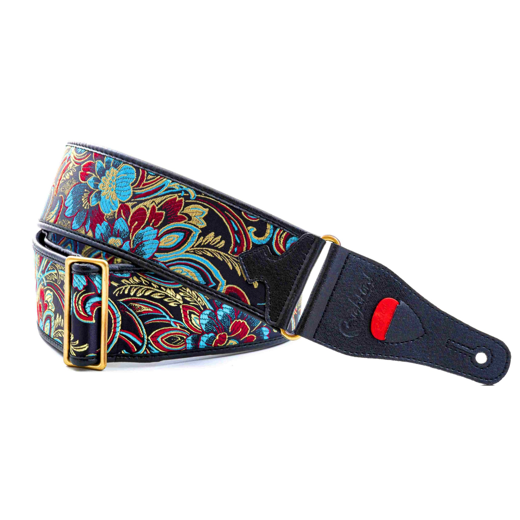 Beppu II Guitar Strap - Beppu (別府市; Beppu-shi) is the Japanese city of hot springs, known for its "hells on earth" and its unique baths found nowhere else in the world. Beppu boasts the largest number of "onsen" (steam vents rising from the earth) in all of Japan, as well as the highest volume of hot water globally. We wanted to dedicate a guitar strap to this fascinating place and found a spectacular fabric that captures that characteristic Japanese style. This strap, with its black background and embroidered botanical motifs, is an absolute beauty, capable of enhancing even the simplest guitar, if one ever considers their guitar plain ;) And if that's the case, this strap will certainly make your guitar look much more elegant.