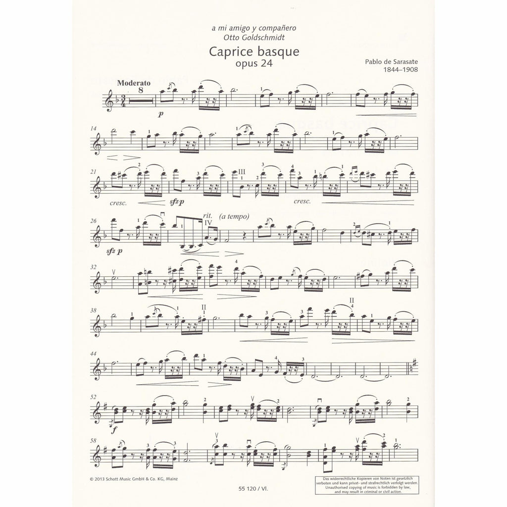Pablo de Sarasate (1844-1908) is one of the most important and successful violin virtuosos of the second half of the 19th century and has become immortal through his virtuoso and highly expressive bravura pieces in the world of violin playing. His concert programme mostly consisted of his own compositions, even if quite a few works had been dedicated to him by fellow composers and tailor-made for him: for example, 'Symphonie espagnole' by Lalo, 'Scottish Fantasia' by Bruch and violin works by Saint-Saëns and Wieniawski. In 'Caprice Basque' (Capricho vasco) Op. 24, Sarasate used Spanish folk tunes. He dedicated this piece to the composer, conductor and pianist Otto Goldschmidt, a pupil of Mendelssohn. This work is influenced by the typically dotted rhythm of the 'zortzico', a Basque dance in 5/8 meter - a virtuoso and rousing piece for virtuosos.