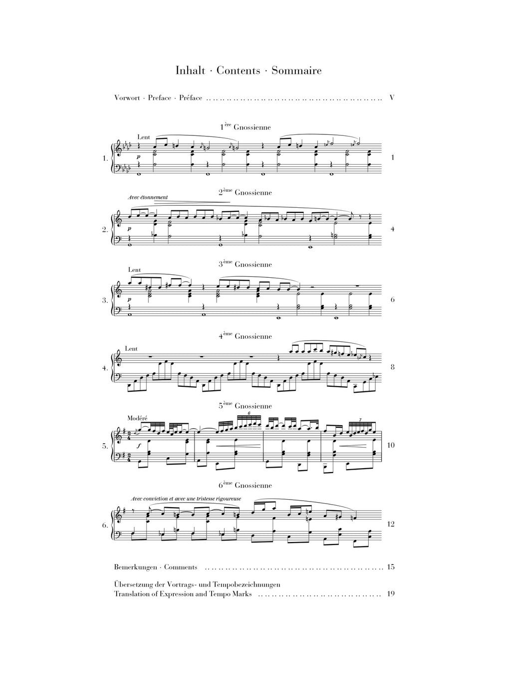 Like the "Gymnopédies", the "Gnossiennes" also allude to ancient Greek traditions. Perhaps inspired by the World Exhibition in Paris in 1889, Satie made use of oriental ornamentation. With his subtle intuition for musical tendencies that were "en vogue", he combined exotic elements with influences from cabaret music and, of course, his own ideas to create something very new. Several of the "Gnossiennes" take one by surprise on account of puzzling fragments of text between the lines of music. According to Satie they were not supposed to be read aloud but to create a secret link between composer and player - a creative challenge, which we are passing on to present-day musicians in our Urtext edition.