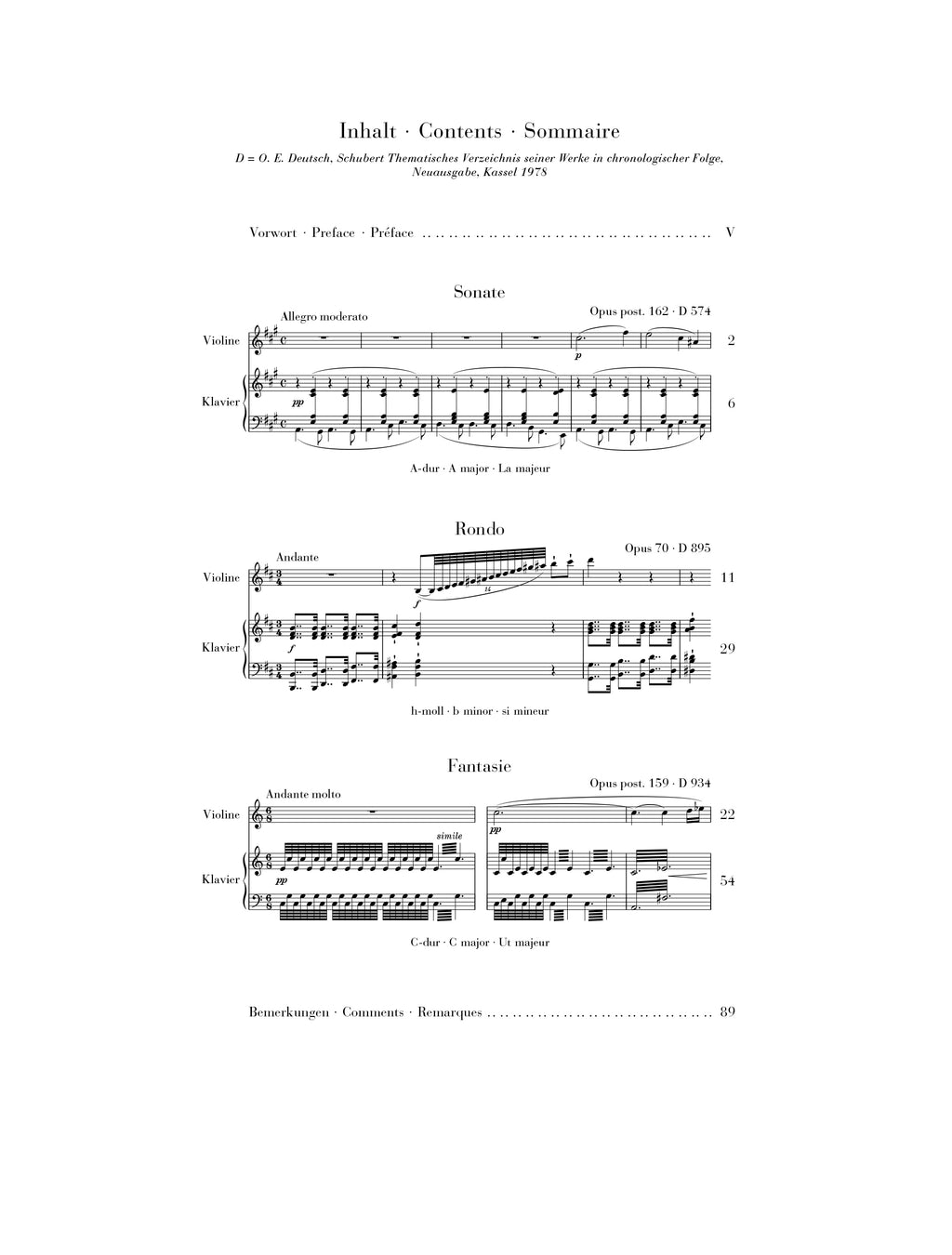 Schubert’s three grand duos for violin and piano occupy pride of place among his foremost works. In the A major Sonata D 574 of summer 1817 he continued to elaborate what was still a simple interplay of the violin and piano in the violin sonatinas (see HN 6) and reached his greatest mastery here. He increased the intensity of his writing into genuine virtuosity in the b minor Rondo D 895 composed in late 1826. The critics of Schubert’s day were already praising “the bold master of harmony” and “the fiery fantasy” of the piece. In the Fantasie in C major D 934, written one year later, Schubert brackets an Andantino with Variations on the song “Sei mir gegrüsst” D 741 with sections that are tastefully interwoven with the theme of the lied.