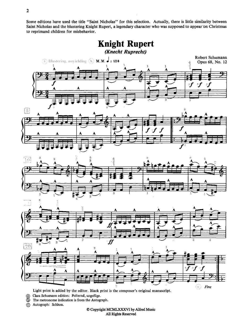 A favourite piano piece from "Album for the Young," Knight Rupert is an excellent example of the short romantic compositions of German composer Robert Schumann. Finger dexterity and independence are especially important in the "B" section, and attention to accents and phrasing will add excitement to the musical story of the legendary knight who was supposed to appear on Christmas to reprimand children for their misbehaviour. This edition is based on Schumann’s Autograph of this work.