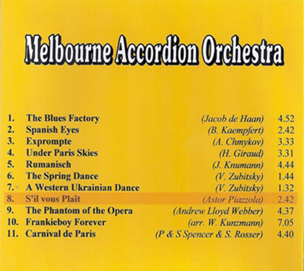 Recorded by the Melbourne Accordion Orchestra and conducted by Iryna Stepko, this CD features a variety of styles from light classical to popular music.