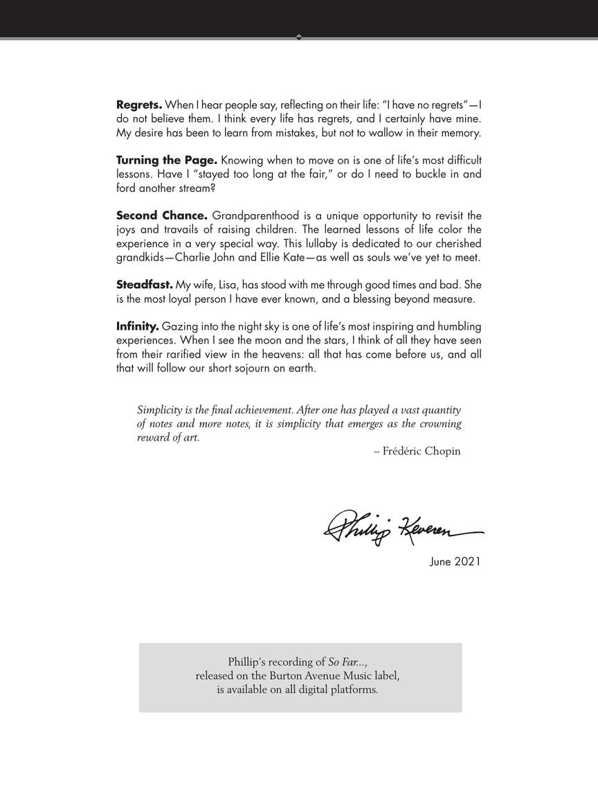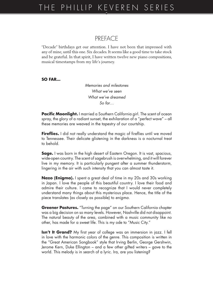 A deeply personal collection of original piano solos from Phillip Keveren commemorating his six decades on the planet. The 12 beautifully written pieces range from intimate reflections to advanced showpieces and represent the important events and loves in his life.