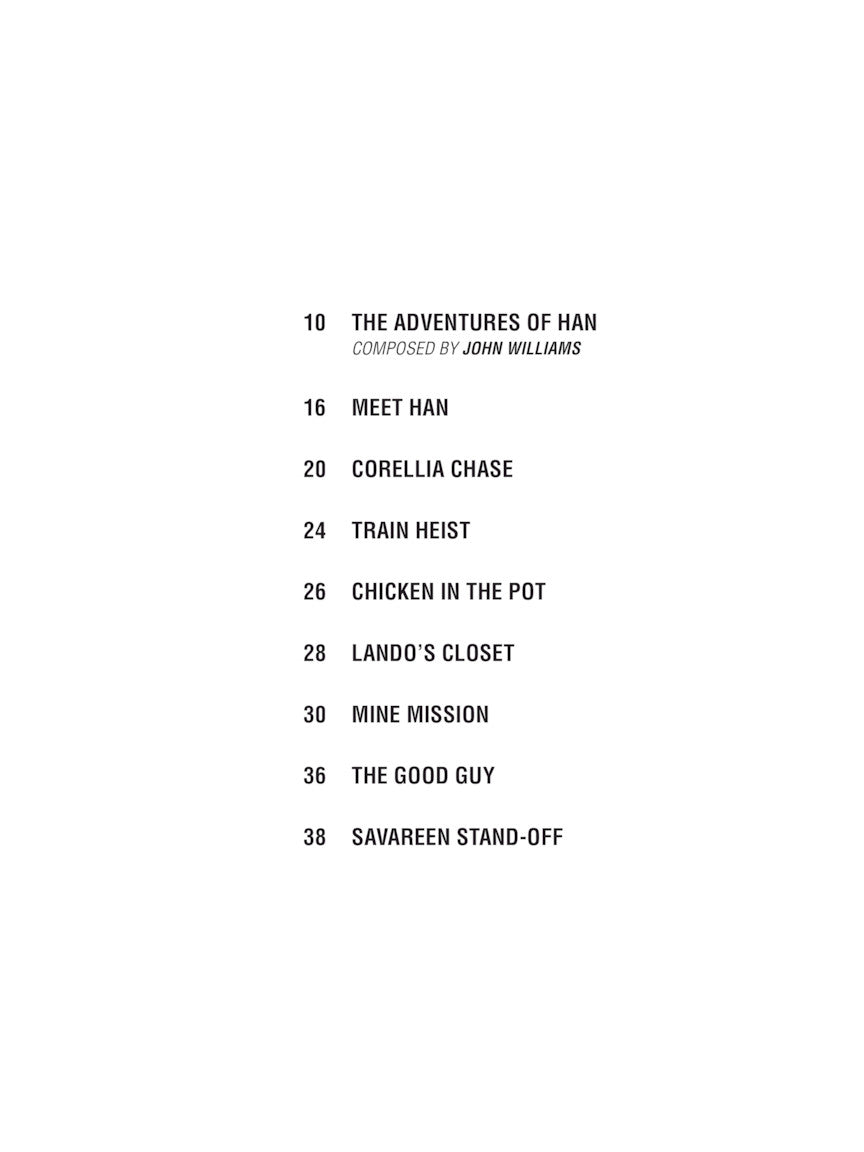 9 selections from the 2018 Star Wars prequel which features the backstory of Han Solo. Includes “The Adventures of Han,” composed by John Williams, plus songs from the score by John Powell: Chicken in the Pot • Corellia Chase • The Good Guy • Lando's Closet • Meet Han • Mine Mission • Savareen Stand-Off • Train Heist. Includes an 8-page section of color artwork from the film!