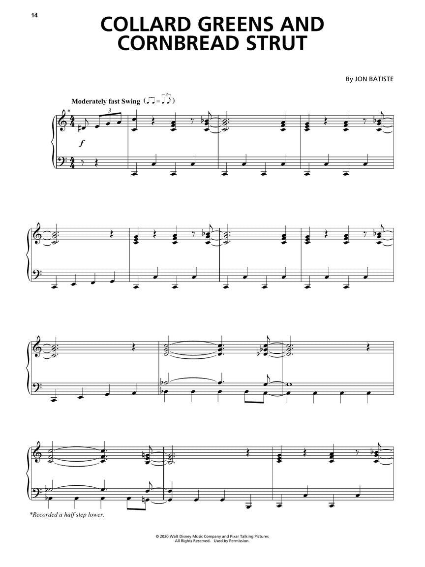 Our souvenir songbook features thirteen tunes from the music featured in and inspired by the 2020 Disney/Pixar release Soul featuring Jamie Foxx as a middle school band teacher in the lead role. This collection includes seven piano solo selections as performed in the movie by Jon Batiste, four jazz classics that served as inspiration, and piano/vocal/guitar arrangements of “It's All Right” and “Parting Ways.” It also includes seven pages of full-colour scenes from the movie.