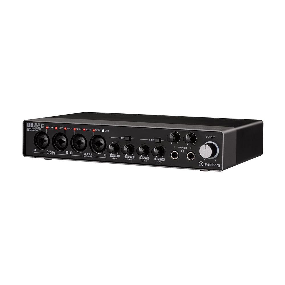 The UR44C is a USB 3.0 audio interface with USB-C connection featuring six inputs, four outputs and MIDI connectivity. Capable of 32-bit/192 kHz audio resolution and hardware-based, latency-free monitoring with DSP-powered effects for a truly professional recording experience. Four balanced Neutrik combo inputs each feed into a D-PRE microphone preamp and there are two additional balanced line inputs, four balanced line outputs plus a main stereo output, two headphone jacks and MIDI in/out sockets.