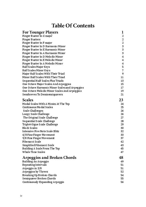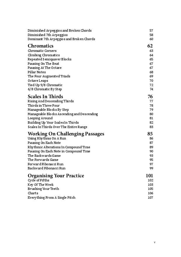 The book is divided into seven chapters focusing on different aspects of playing. The first chapter is for the younger player who may be new to focused technical work while the final chapter provides some ideas for the more advanced player to structure their technical practice. In between you’ll discover plenty of exercises on scales, arpeggios, broken chords, chromatics, thirds and even a chapter on practicing difficult passages.