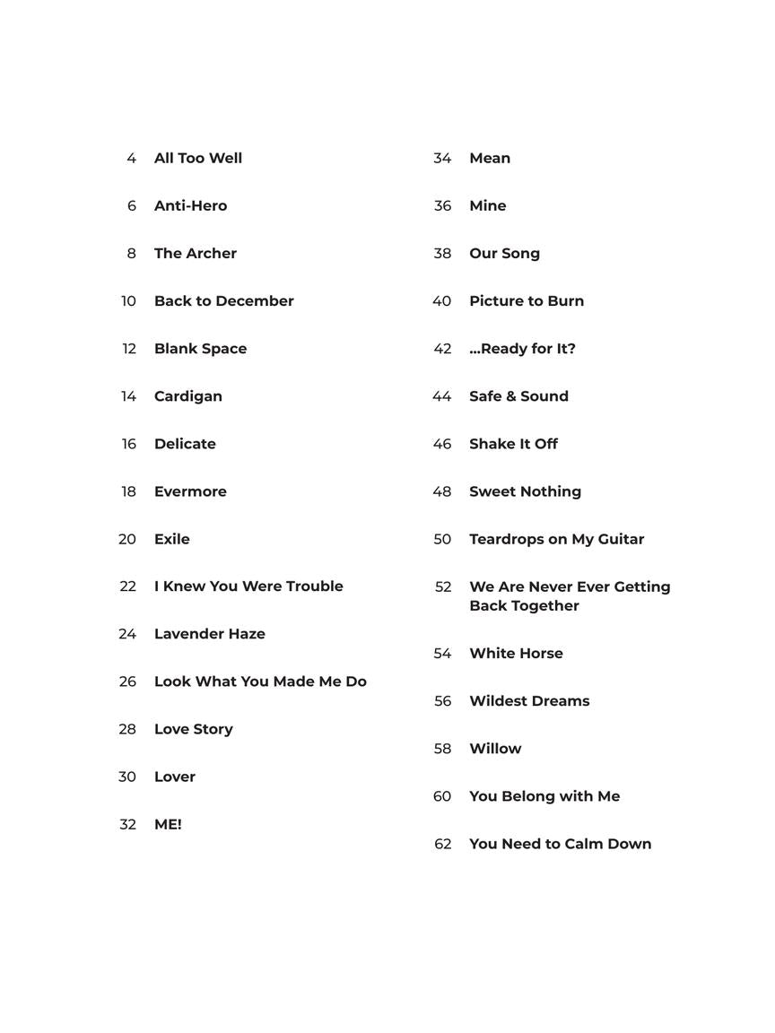 This collection features 30 of Taylor's best from her entire career arranged so even beginners can sound good! Each song is arranged with simple right-hand melody, letter names inside each note, basic left-hand chord diagrams, and no page turns. Songs include: All Too Well • Anti-Hero • Blank Space • Cardigan • Lavender Haze • Love Story • Mean • Shake It Off • Teardrops on My Guitar • We Are Never Ever Getting Back Together • Wildest Dreams • Willow • You Belong with Me • You Need to Calm Down • and more.