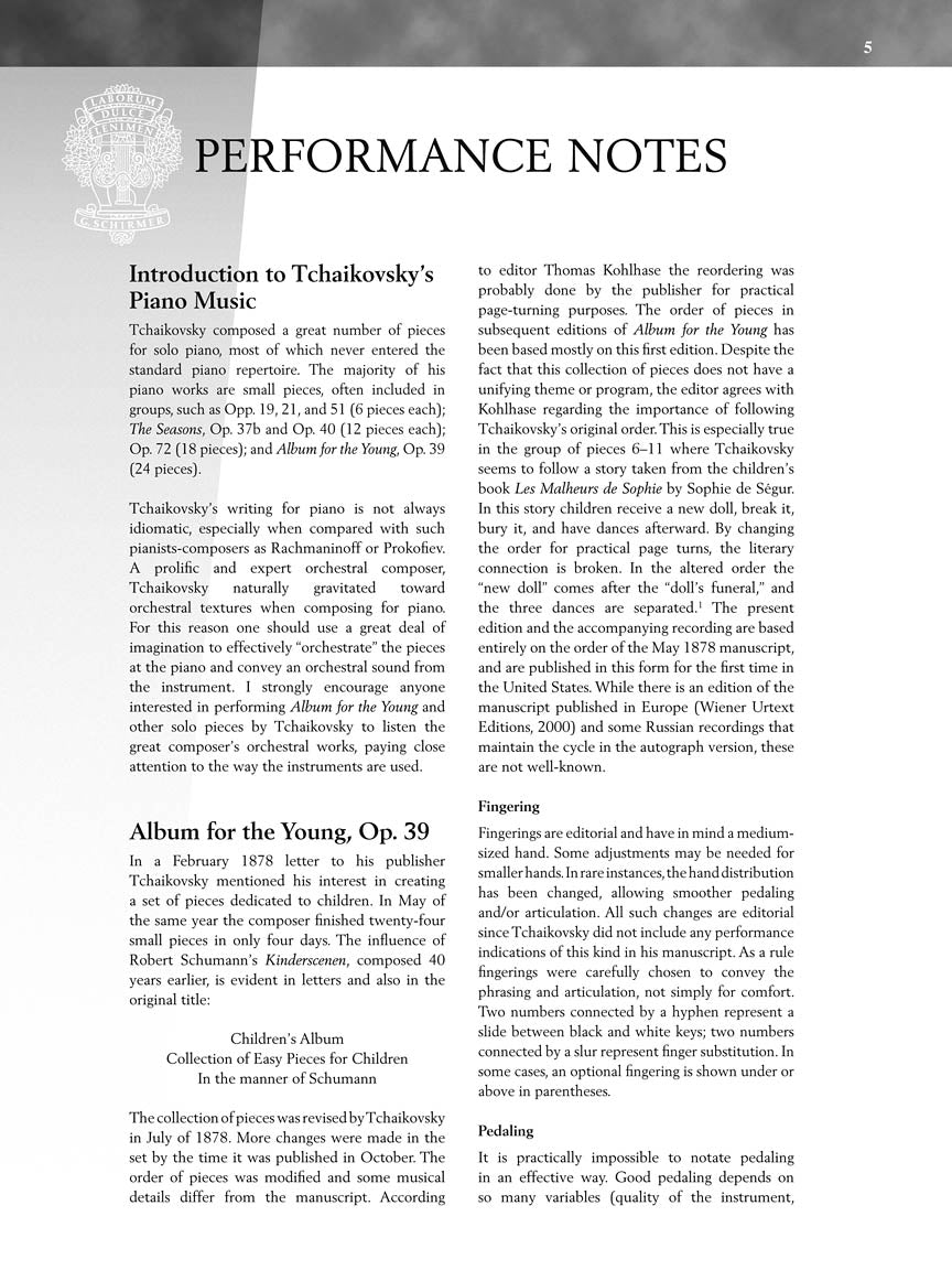 Completed in four days, these 24 fanciful miniatures capture some delightful observations and experiences that any youth might enjoy. This is the first American edition based on the composer's original manuscript. Since the pieces were published in 1878, they have become part of the standard educational piano literature and make a necessary addition to the Schirmer Performance Editions.