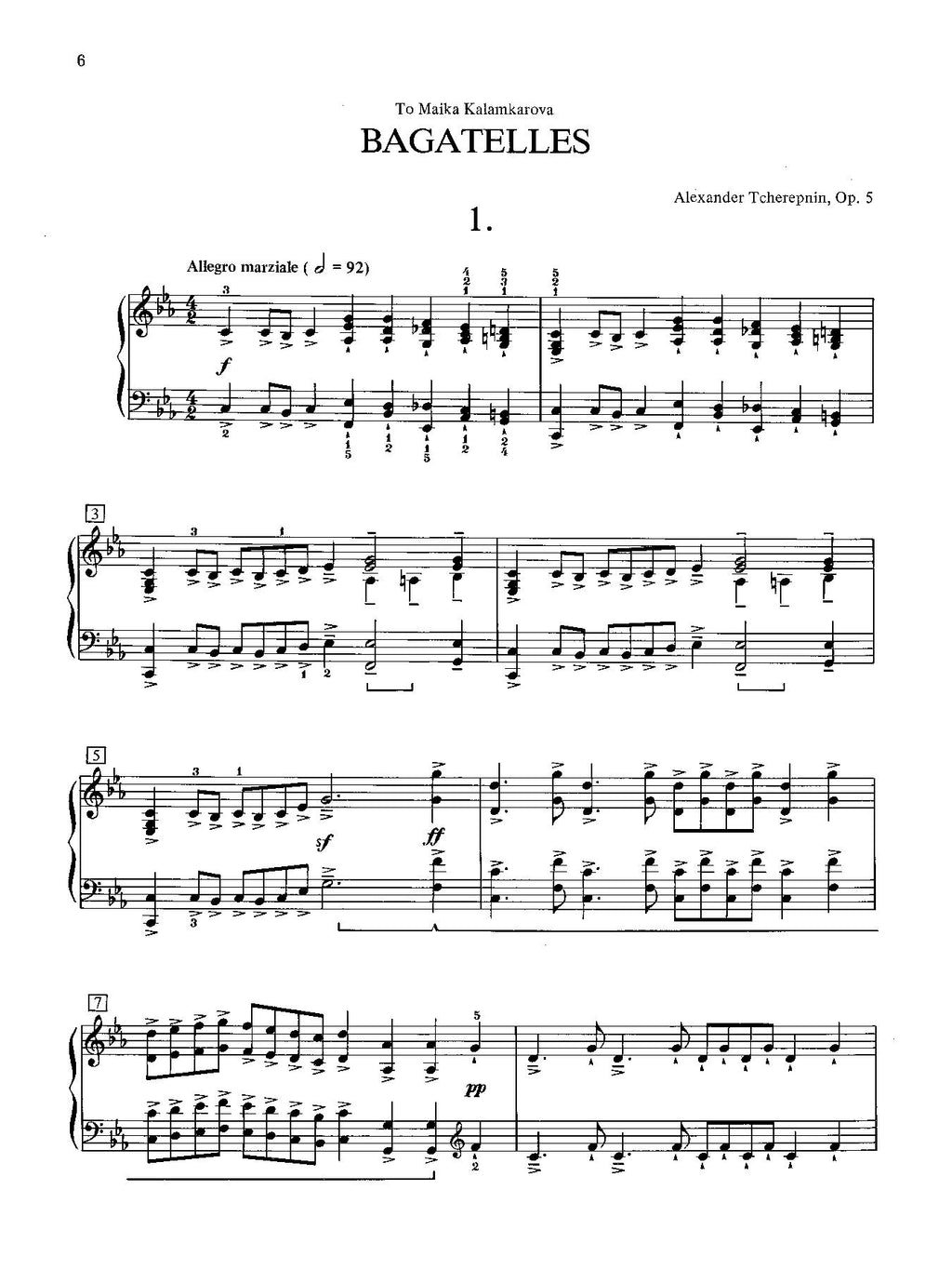 Alexander Tcherepnin's (1899-1977) Bagatelles are among his finest and most popular keyboard works. The 10 miniatures each span only two to four pages, yet are filled with a variety of mildly contemporary techniques. The more brilliant pieces help to develop a rapid finger technique, while the lyrical works are studies in the balance of melody and accompaniment figures. Lynn Freeman Olson's edition is carefully researched and includes helpful study notes. Bagatelles Nos. 1 and 10 are Federation Festivals 2016-2020 selections. A Federation Festivals 2020-2024 selection.