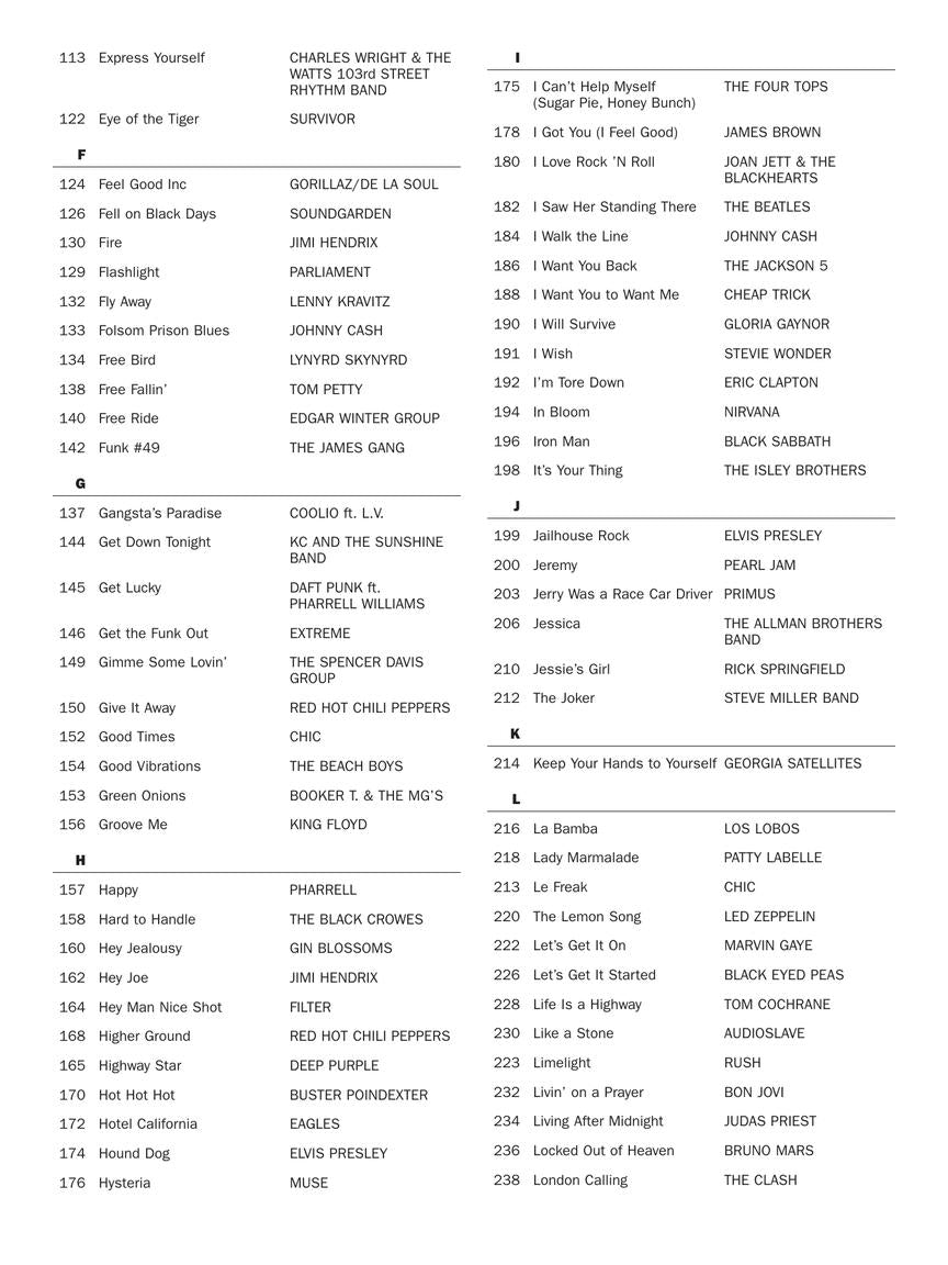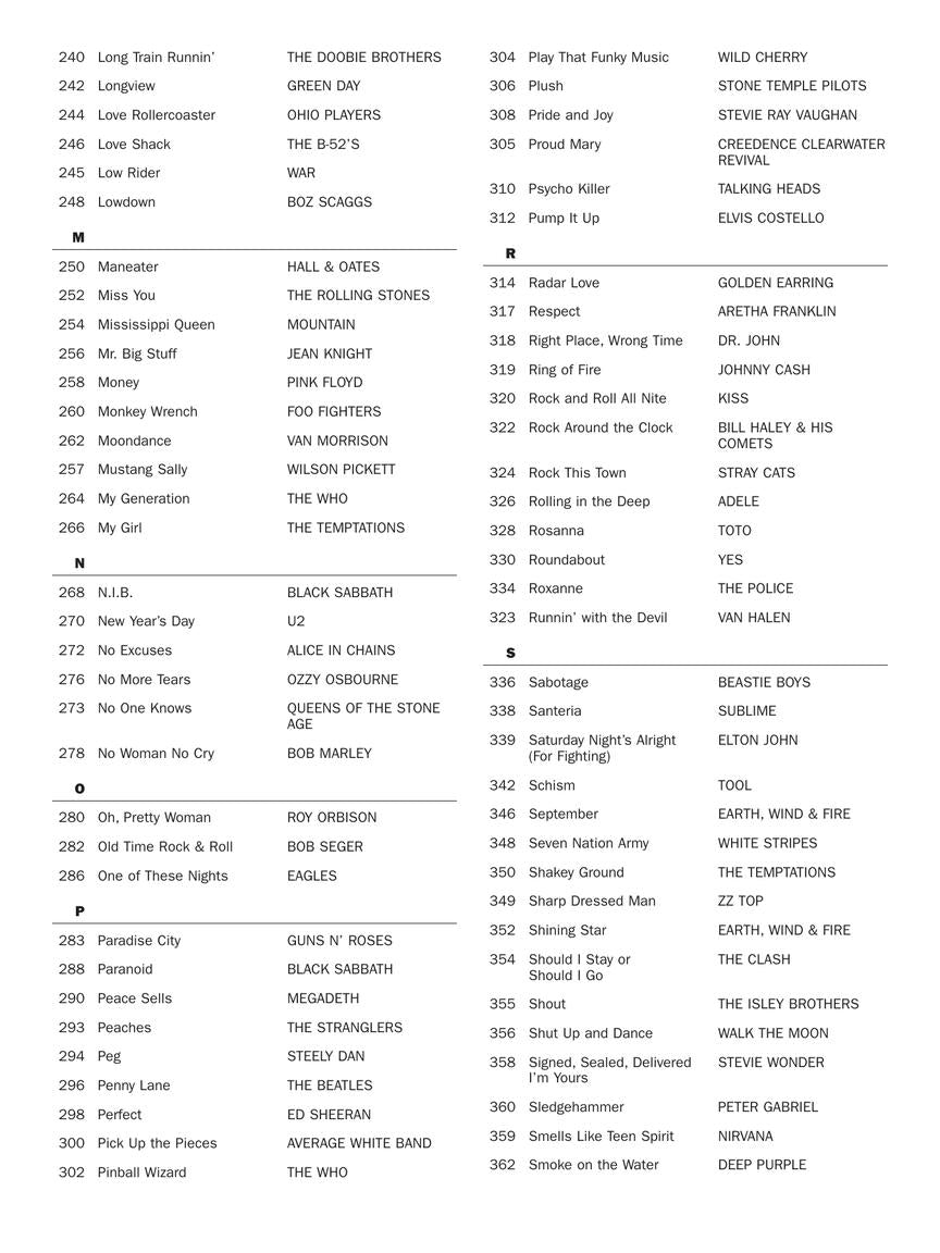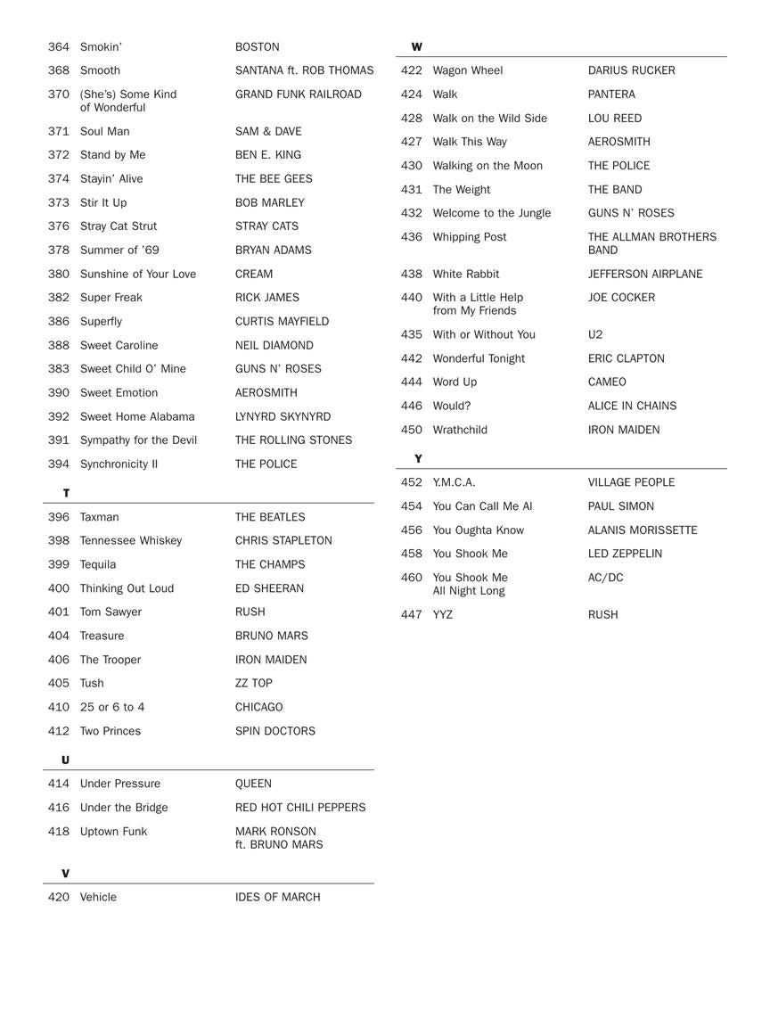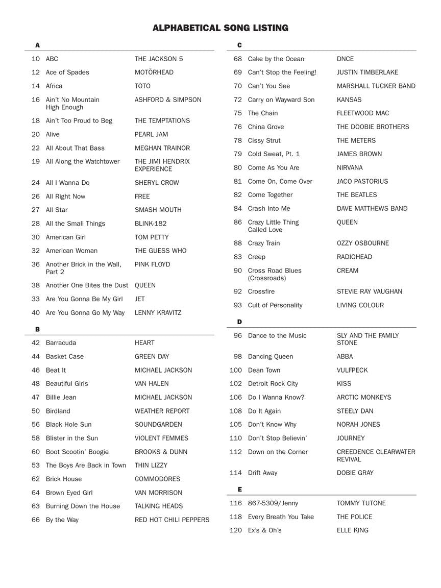 Songs include: ABC • Africa • Ain't No Mountain High Enough • All About That Bass • All Along the Watchtower • All Right Now • American Girl • American Woman • Another Brick in the Wall, Part 2 • Another One Bites the Dust • Barracuda • Beat It • Billie Jean • Black Hole Sun • Blister in the Sun • Can't Stop the Feeling! • China Grove • Crazy Little Thing Called Love • Crazy Train • Cult of Personality • Detroit Rock City • Don't Stop Believin' • Every Breath You Take • Eye of the Tiger • Folsom Prison Blues • Free Bird • Gangsta's Paradise • Get the Funk Out • Hotel California • I Love Rock 'N Roll • I Will Survive • Iron Man • The Joker • Limelight • London Calling • Love Rollercoaster • Love Shack • Oh, Pretty Woman • Paranoid • Peaches • Pride and Joy • Psycho Killer • Respect • Rolling in the Deep • Seven Nation Army • Shout • Smells like Teen Spirit • Smoke on the Water • Stand by Me • Tennessee Whiskey • and hundreds more!