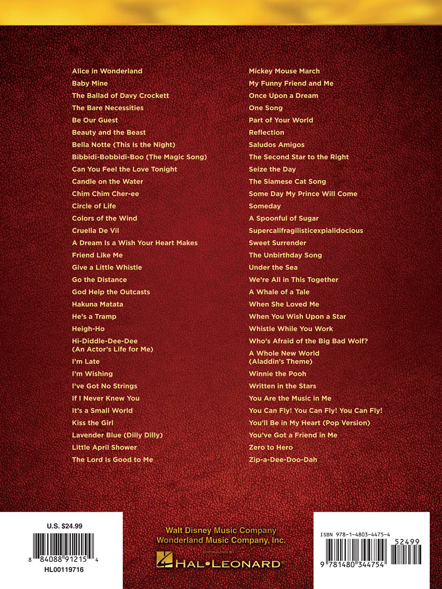 64 classic and contemporary Disney songs are featured in this collectionfor easy piano, including: Alice in Wonderland • Beauty and the Be ast • Colors of the Wind • Friend like Me • Go the Distance • Hakuna Matata • It's a Small World • Mickey Mouse March • Part of Your World • Reflection • A Spoonful of Sugar • When She Loved Me • You Can Fly! You Can Fly! You Can Fly! • Zip-A-Dee-Doo-Dah • and more.