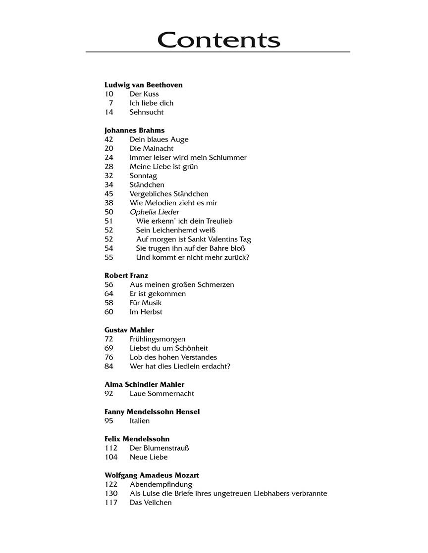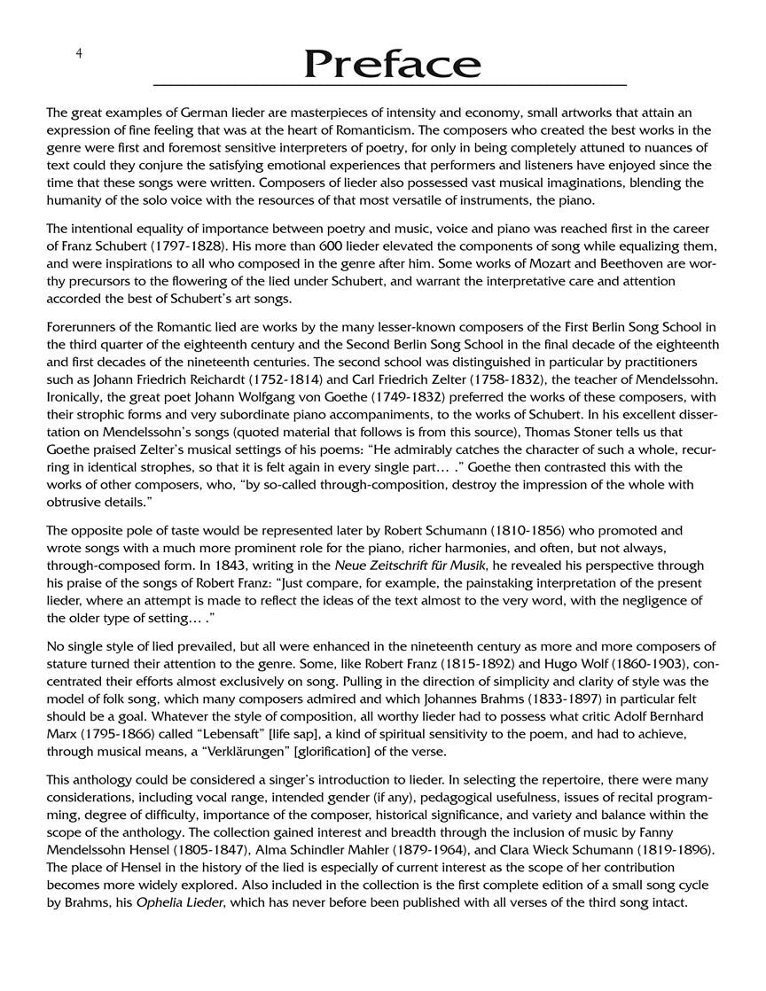This edition presents 65 diverse songs by major composers of German art song, or lieder, and is the perfect one-volume lieder source for voice students. All the songs are new Vocal Library editions. Historical notes about the relevant history and background of each song are included, as are line-by-line translations for study.