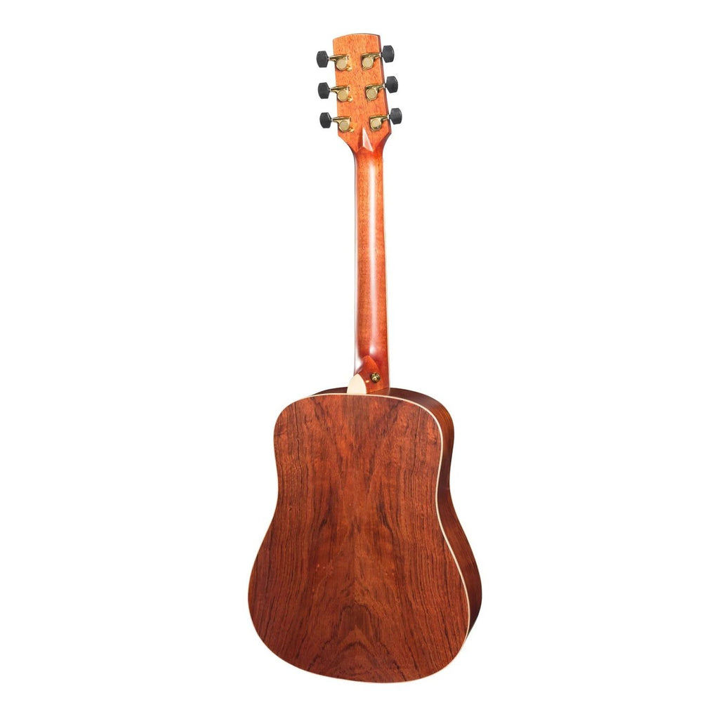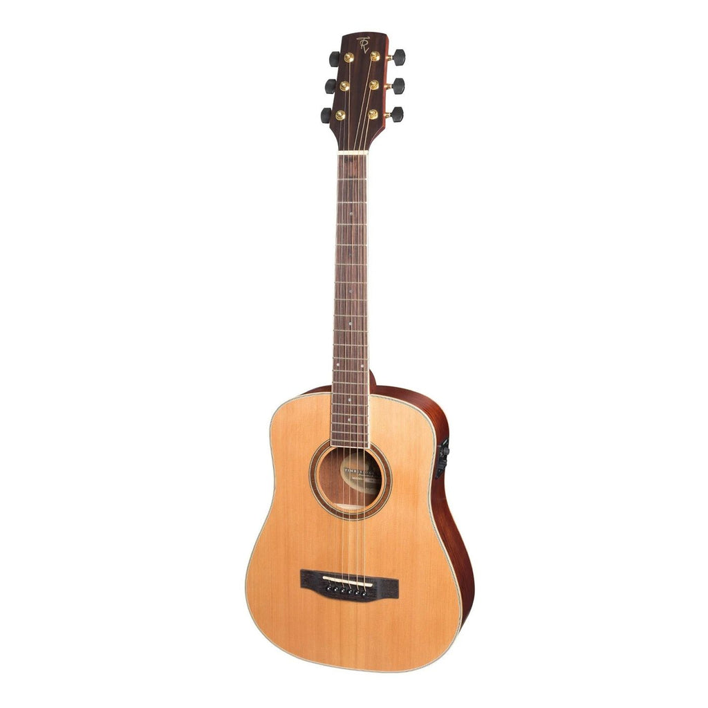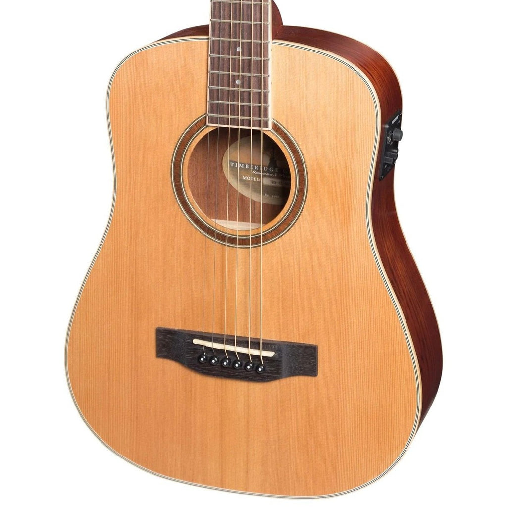 With the Timberidge Mini series, Timberidge took everything you love about a full sized dreadnought acoustic guitar and shrank it, creating the perfect travel companion. Don't let its size fool you, the Timberidge mini series has been crafted with the same care and attention to detail as any other Timberidge guitar, resulting in excellent projection and tone, easy playability and stunning good looks. Featuring a solid cedar top, exotic bubinga back and sides, Fishman ISYS+ preamp system paired with the Fishman Sonicore pickup, inbuilt tuner, bone nut and saddle and maple binding, the Timebridge 4 series mini is a serious guitar in a compact package.