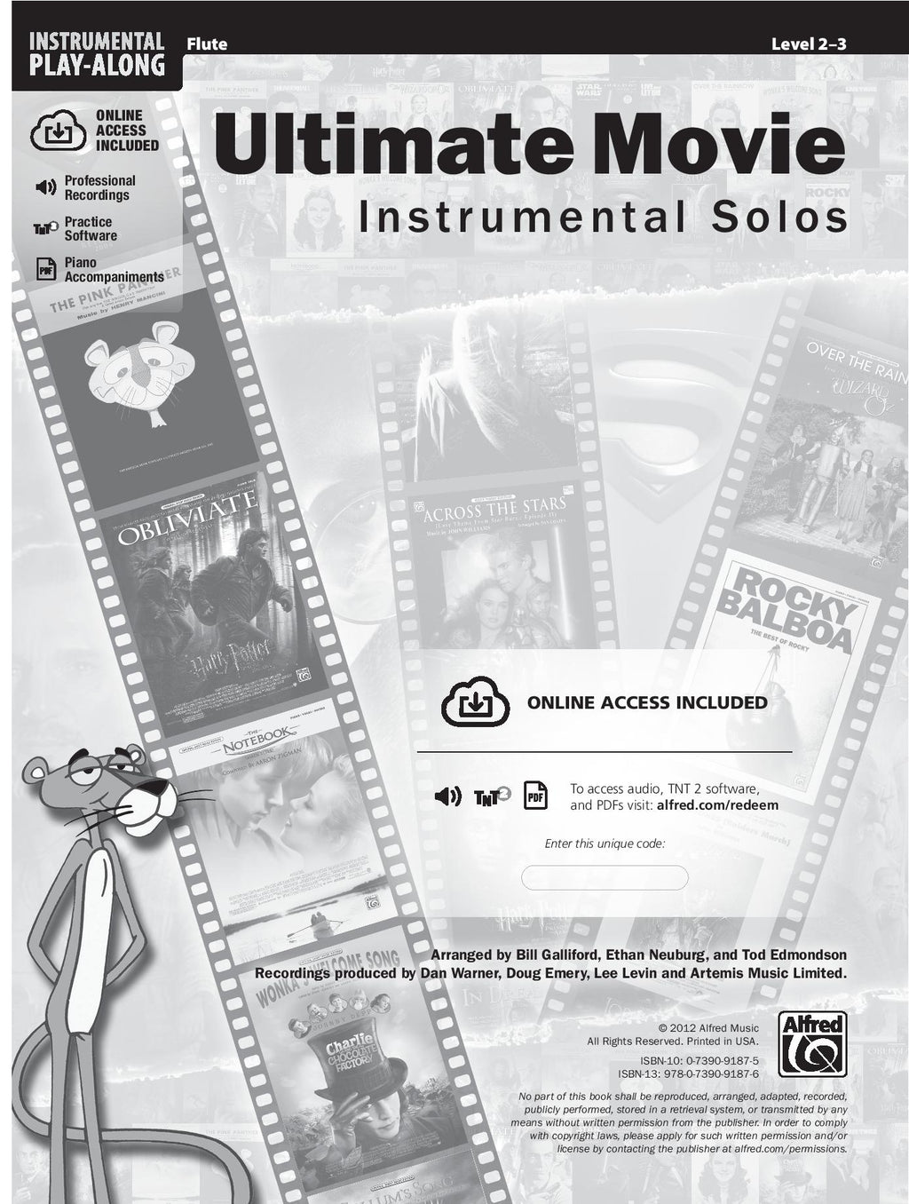 Alfred's Ultimate Movie Instrumental Solos series arranged for flute, clarinet, alto sax, tenor sax, trumpet, horn in F, trombone, violin, viola, cello, and optional piano accompaniment. All wind instrument arrangements are fully compatible, and can be successfully performed as ensembles or solos by students who have completed the first book of any standard band method. A fully orchestrated accompaniment recording is provided, featuring each song as a live performance demo track followed by a play-along track. The media also includes a PDF of the Piano Accompaniment and Alfred's Tempo Changer Software.