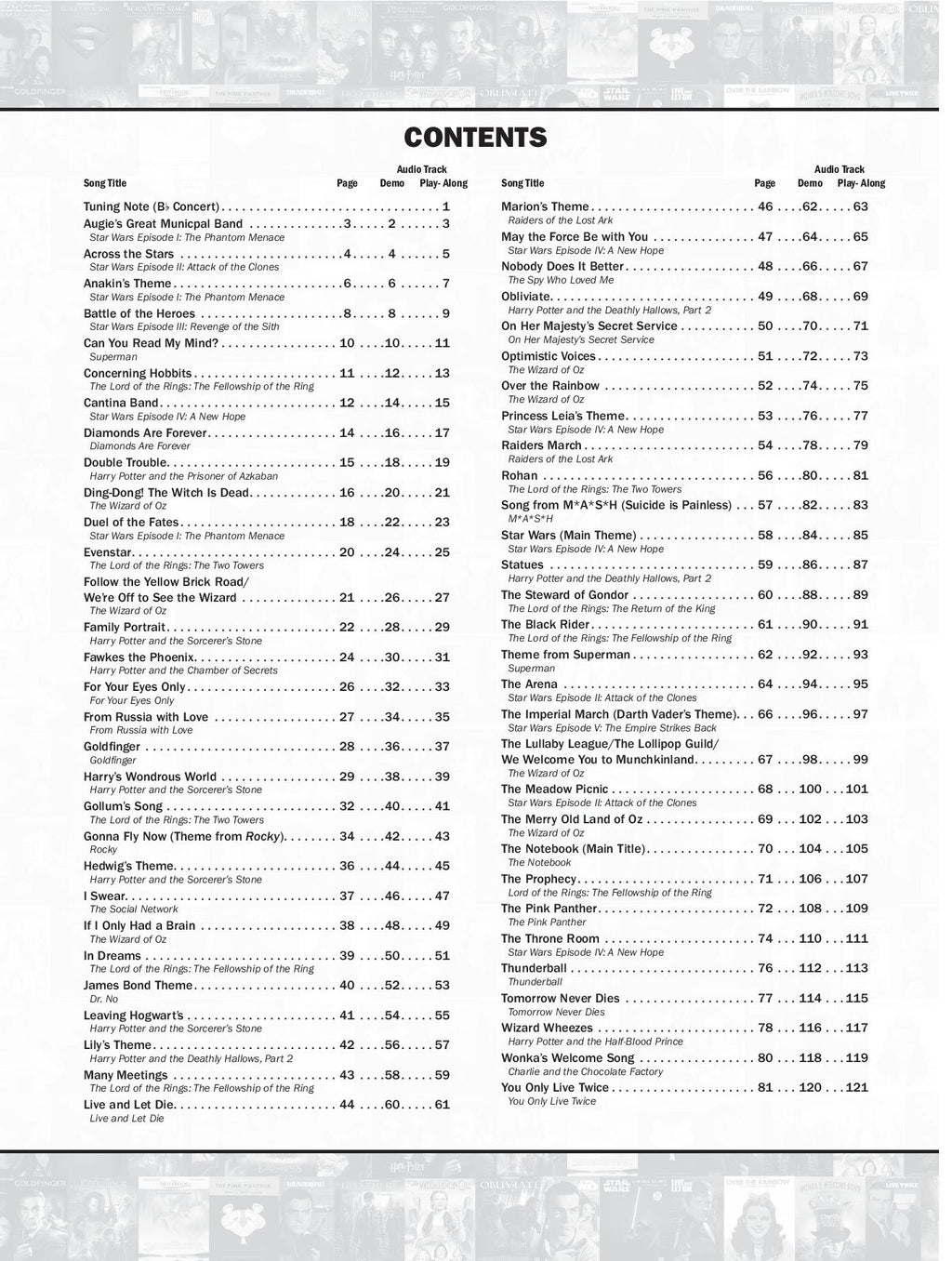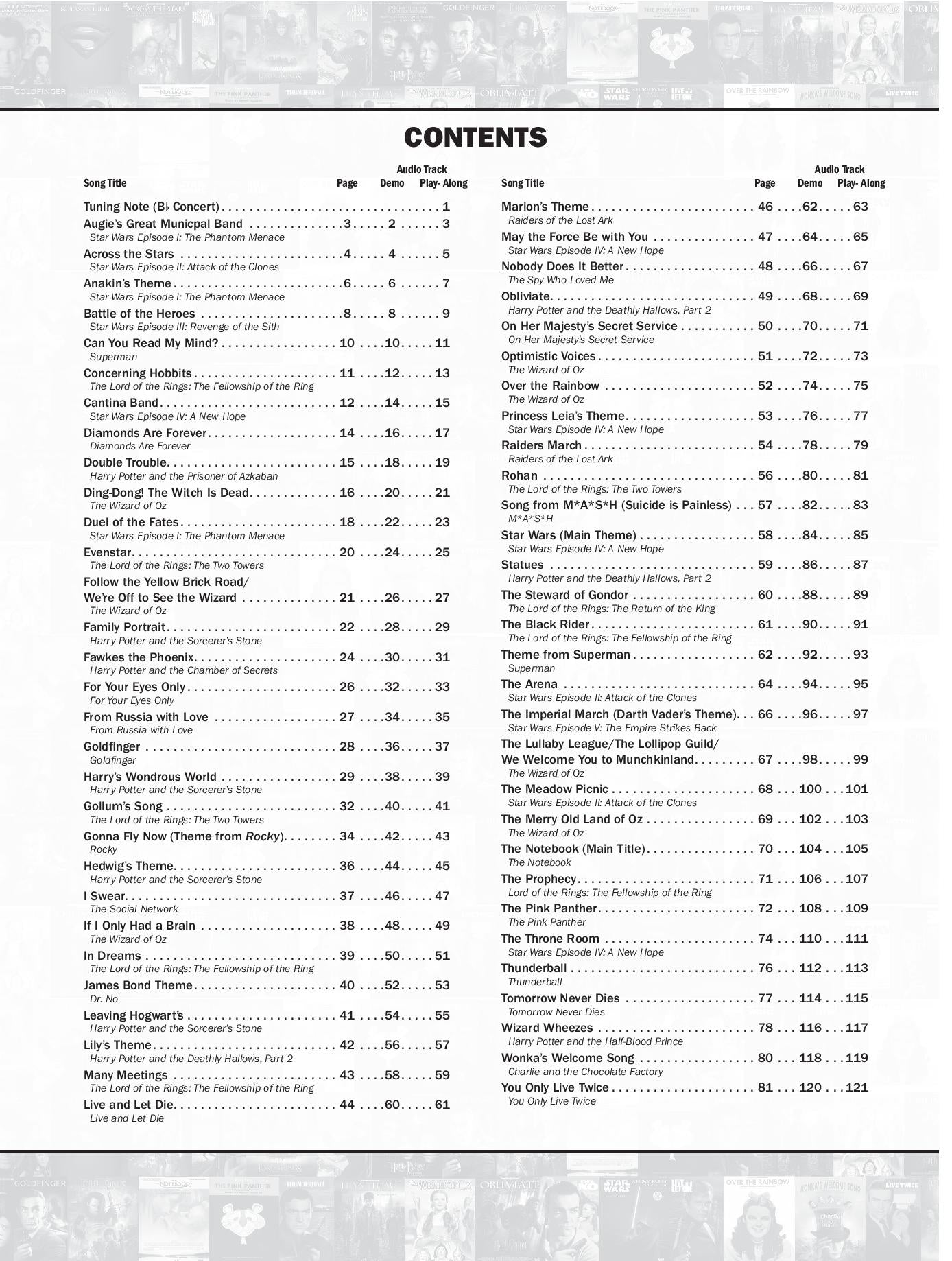 Contains 60 songs, including: Cantina Band * Follow the Yellow Brick Road / We're Off to See the Wizard * Gollum's Song * Hedwig's Theme * James Bond Theme * Obliviate * Pink Panther Theme * Raiders March * Superman Theme * Wonka's Welcome Song * and many more.