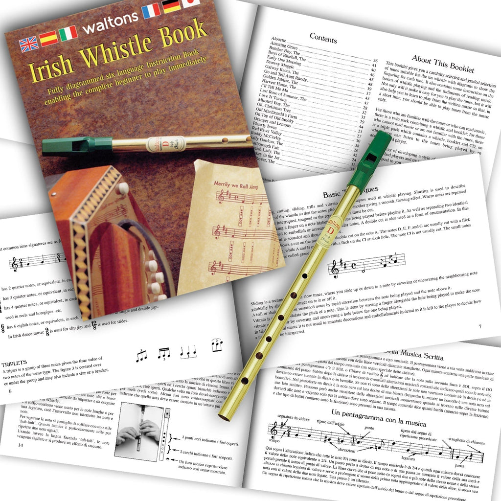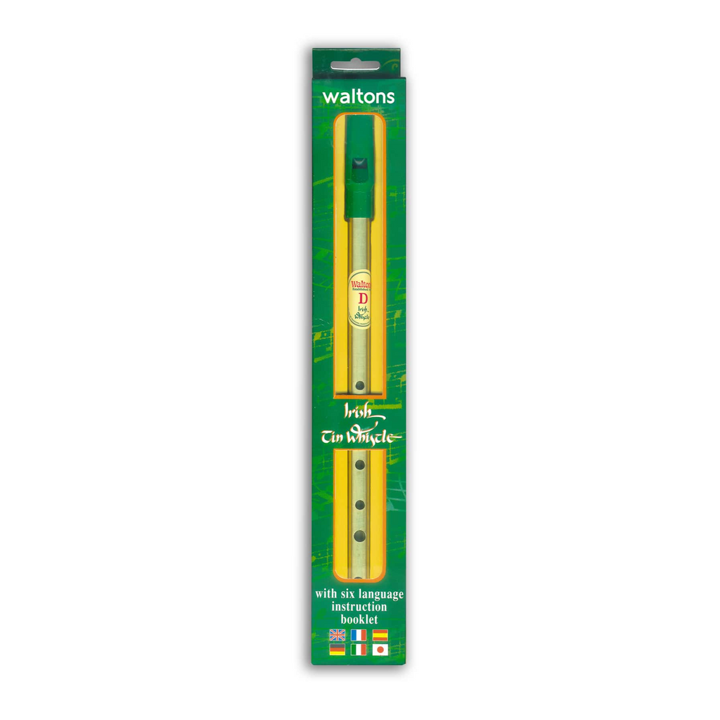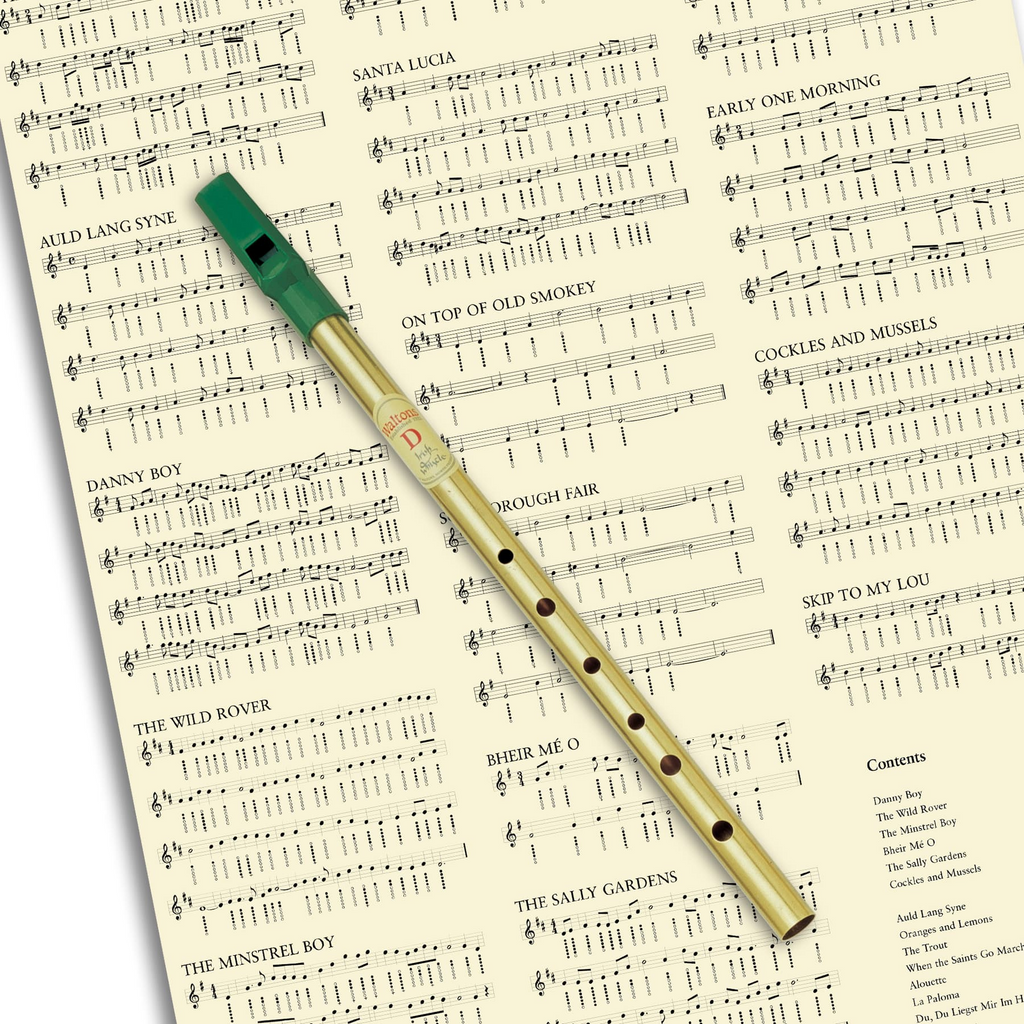 Deluxe brass tin whistle with six-language* instruction leaflet containing over 20 popular Irish and international tunes. Key of D.
