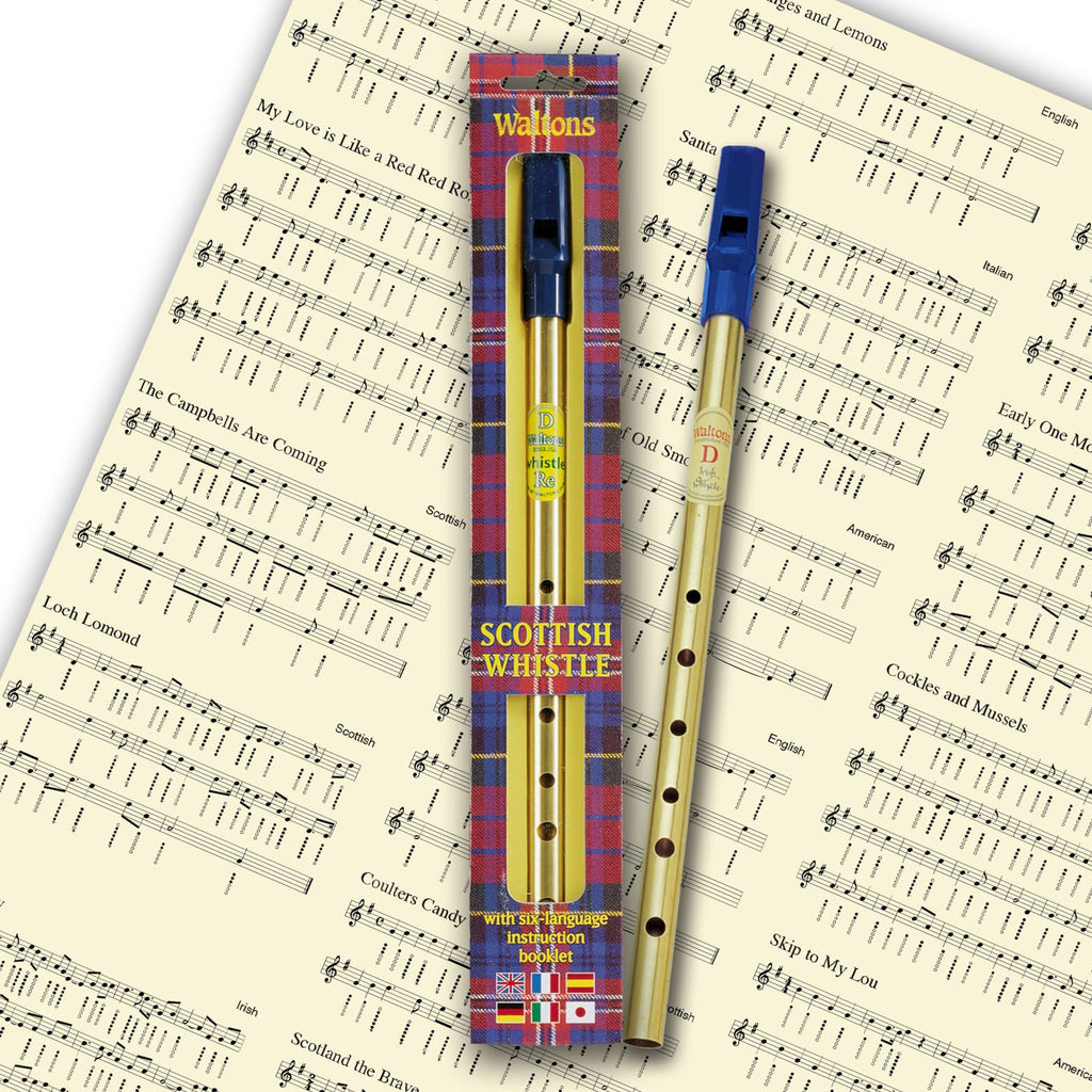 Deluxe "Scottish" tin whistle with six-language* instruction leaflet containing over 20 popular Scottish and international tunes. Key of D.