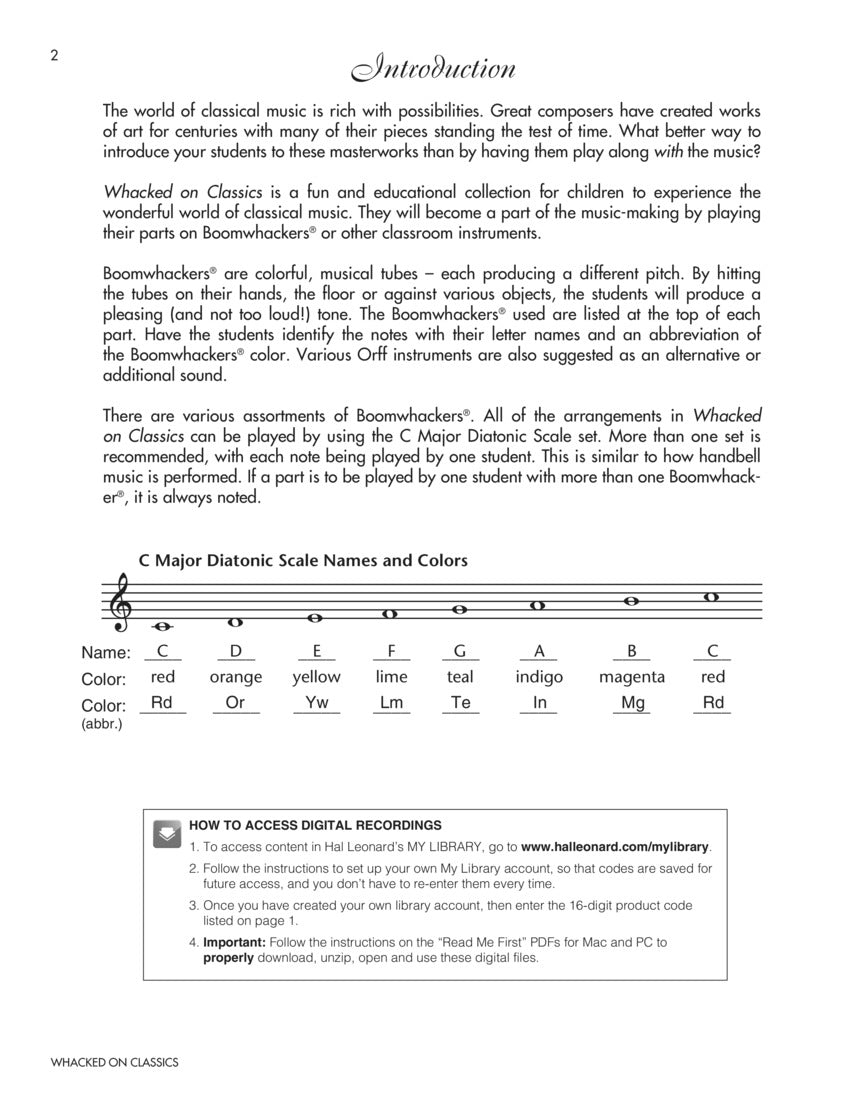 Here is a fun and creative way to introduce your students to some of the greatest classical hits of all time! Using Boomwhackers, xylophones and other classroom instruments, students will experience some of the best known pieces from music history! These reproducible instrument parts are easy and user-friendly. The classical melodies can be performed by using the piano arrangements or the online professionally-produced recordings for added play-along excitement! All of the arrangements in Whacked on Classics use the C Major Diatonic Scale set of Boomwhackers. Easy-to-follow teaching procedures are also included, along with reproducible information sheets about each composition and composer.