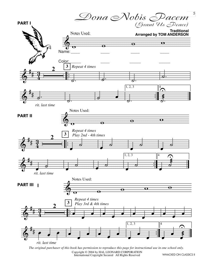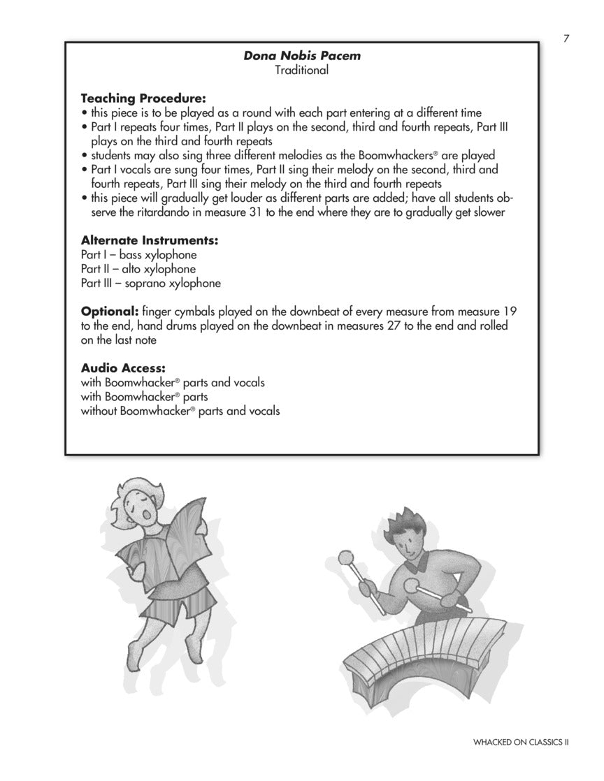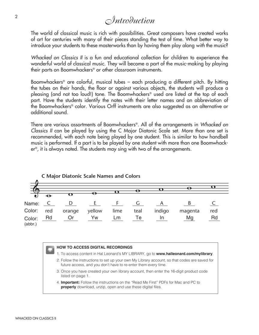Explore more classical “hits” from music history with these fun and creative arrangements for playing along with the masters! Students accompany each of the 8 compositions using Boomwhackers®, xylophones and other classroom instruments. The classical melodies can be performed from the piano arrangements or AUDIO ACCESS to professionally-produced recordings for added play-along excitement! All of these arrangements use the C Major Diatonic Scale set of Boomwhackers®. For further value, instrument parts are all reproducible. Easy-to-follow teaching instructions and reproducible information sheets about the composers and compositions provide even more educational opportunities. Featured songs and composers: Dona Nobis Pacem (Grant Us Peace), Rondeau (Purcell), Minuet (JS Bach), Symphony No. 9 “Ode to Joy” (Beethoven), Habanera from “Carmen” (Bizet), March from “The Nutcracker” (Tchaikovsky), In the Hall of the Mountain King from “Peer Gynt” (Grieg), Pavane (Faure). The price of this book includes a unique code that provides access to audio tracks online, for download or streaming. The tracks include PLAYBACK+, a multi-functional audio player that allows you to slow down audio without changing pitch, set loop points, change keys, and pan left or right - available exclusively from Hal Leonard. Suggested for grades 4-8.