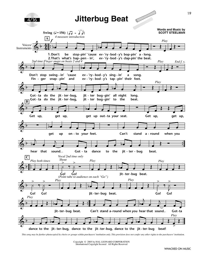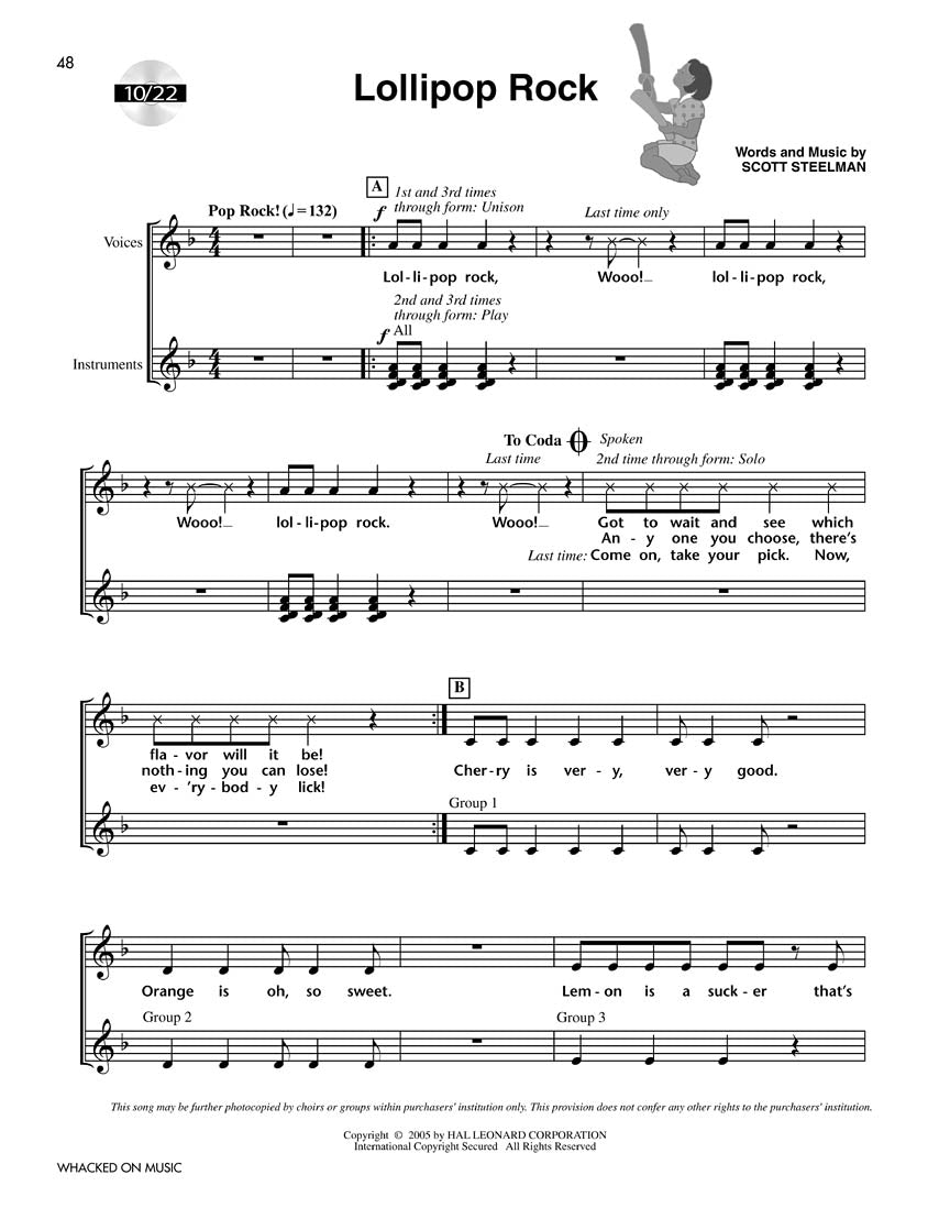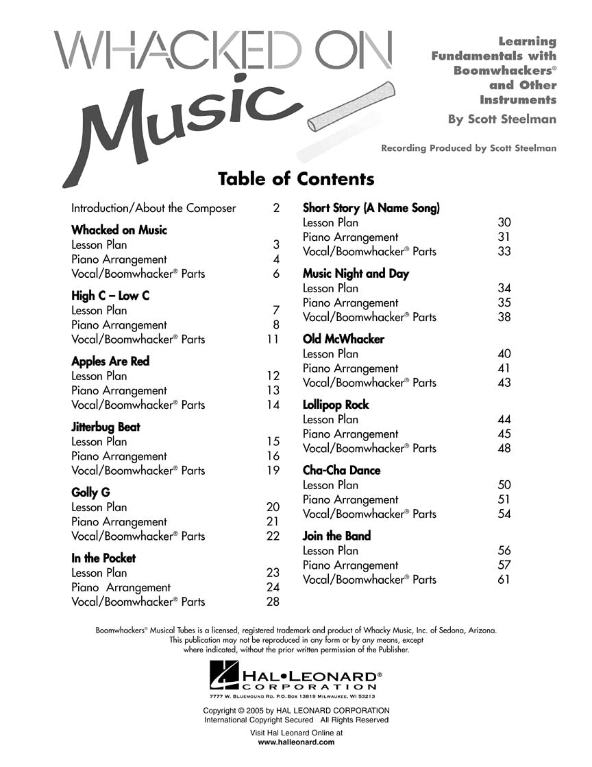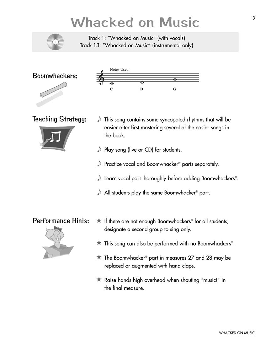 Get back to basics with this whacky collection that reinforces musical concepts in a creative and fun way! From Old McWhacker to Golly G, your students will learn all about steady beat, letter names of notes, solfege syllables, simple rhythms, ensemble playing, musical styles, instrument s of the orchestra and much more! Cleverly arranged for voices, Boomwhackers® and other classroom instruments, this collection of 12 original songs is great for lighter programs or general music and can be performed with the piano arrangements or the enclosed CD! All of the songs use the C Major Diatonic Scale set of Boomwhackers ®. Easy-to-follow teaching instructions and reproducible singer and instrument parts are included for extra value. WHACKED ON MUSIC is sure to be a 'hit' with your students! Available: Book/CD Pak (with reproducible singer/instrument parts). For Gr. 2-5.