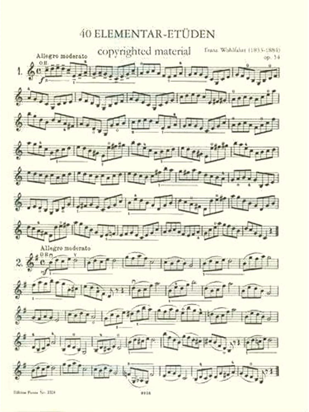 Wohlfahrt's 40 Elementary Studies, Op. 54, focuses on the basics of violin-playing, like finger patterns, intonation, tone, and bow distribution. In addition, these first-position exercises are intended to develop different basic bow strokes, like staccato and martele; and develop speed and agility in the left hand.