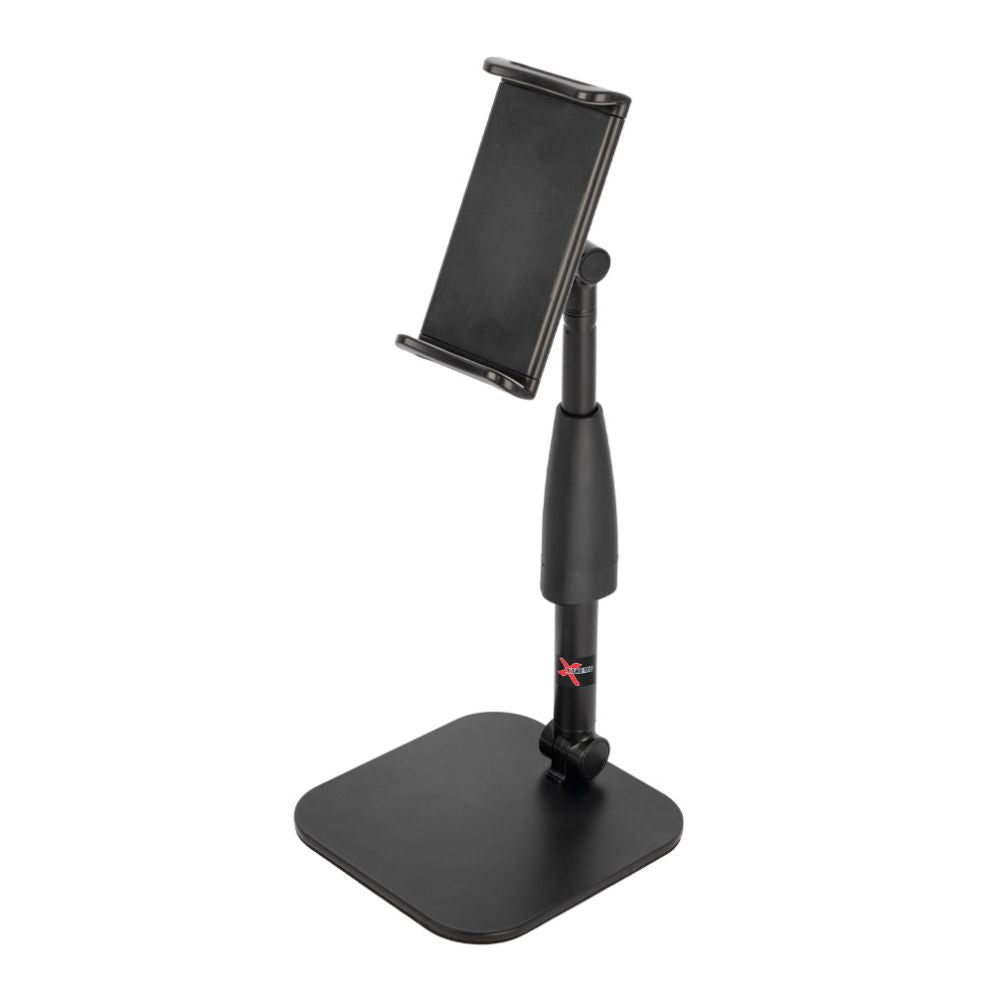Non-slip low profile metal base for extra stability. 2 interchangeable multi adjustable cradles to suit a wide range of Smartphones and tablets. Small cradle extension range: 6-8cm. Large cradle extension range: 12-20cm. 360 degree rotation. Protective padding at contact points. Extendable upright with angle adjustment. Height adjustable 18-25cm. Black.