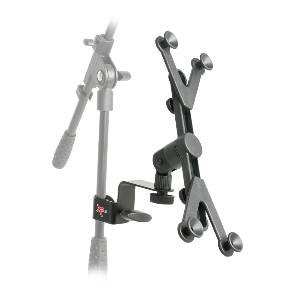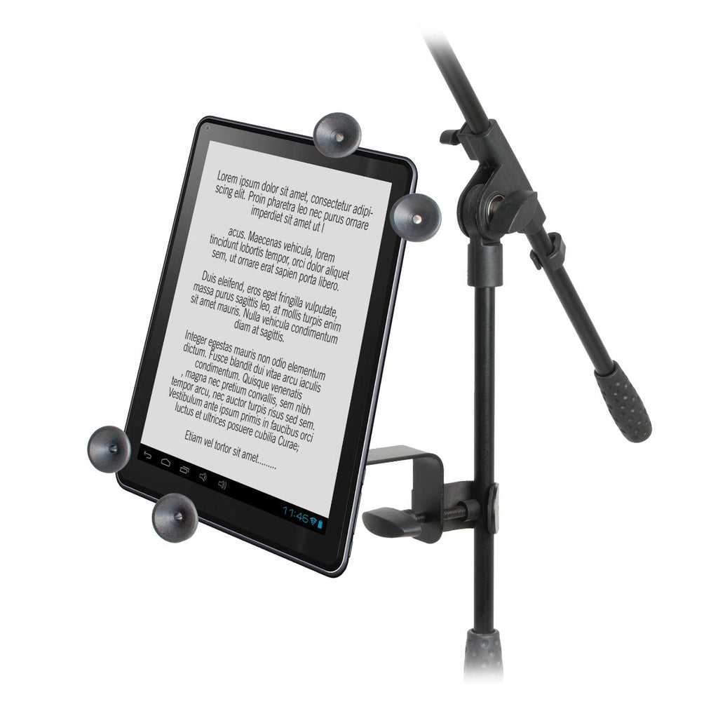 - Bracket and clamp attached to mic stand and secures the tablet for easy access and viewing